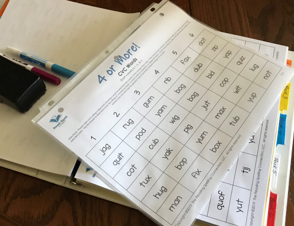 The “4 or More!” games are designed as a simple grid of words that give a student additional practice reading words that include the new concept or spelling rule that was recently taught in a specific Barton lesson. They are sold in sets, one set for each of the Barton Reading and Spelling System® levels, Books 2-10. Each set has at least 1 game board for every lesson within that Book.